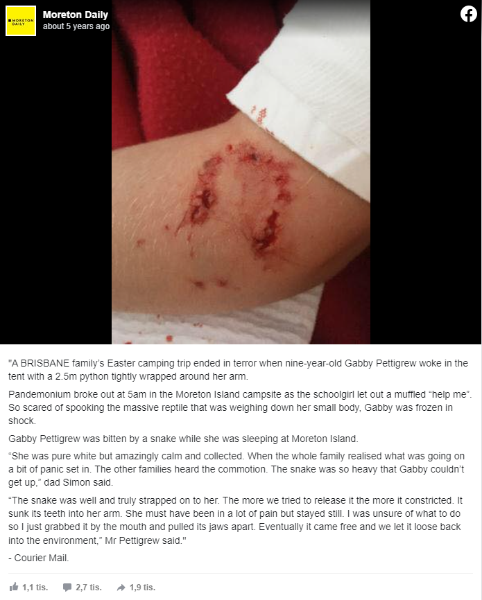 Obitelj Pettigrew iz Australije otišla je kampirati na otok Moreton. Sve je djelovalo savršeno, sve dok otac u pet ujutro nije čuo kako njegova devetogodišnja kćerka Gabby šapuće kroz stisnute zube “upomoć”, dok joj je se oko ruke omotao piton dugačak oko dva i po metra.